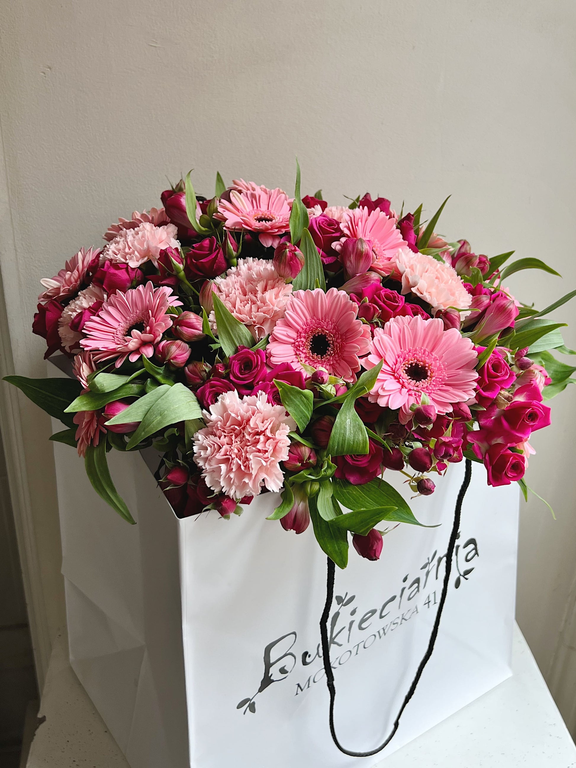Elegancka klasyka, w której intensywne róże krzewiaste w odcieniu fuksji łączą się z pudrowymi goździkami i soczysta alstromerią. Różowe gerbery wprowadzają lekkość i rytm, nadając całości graficznego charakteru.